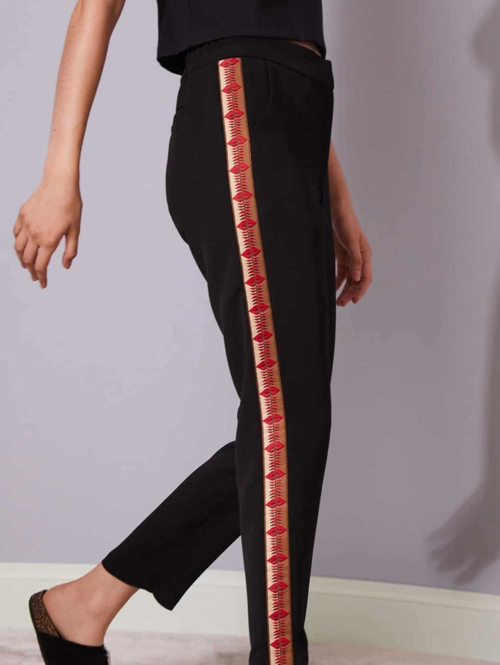 Pantalón sastrero con combinación de tejidos. En el lateral lleva una cinta tejida estampada. El diseño de estampa Bocas es un clásico de Jazmin que esta vez se reversiona mediante la superposición de bocas asimétricas y orgánicas.